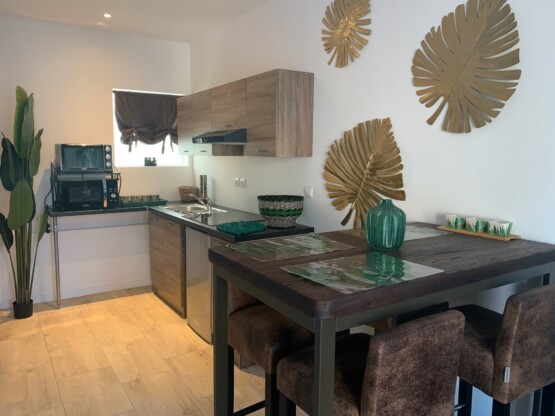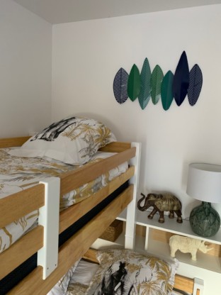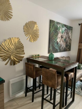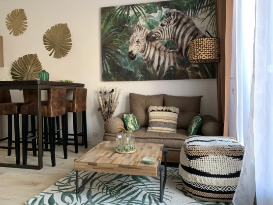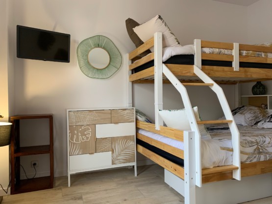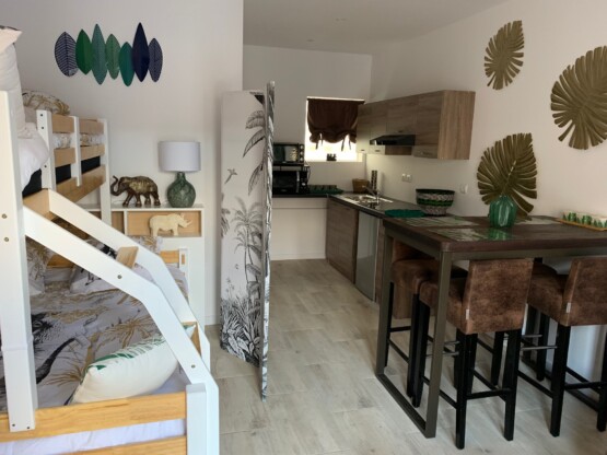 This room, which is not unlike the famous book of the great R. Kipling, can accommodate two adults and a child. It consists of a bedroom area with double bed and single bed in mezzanine, a living room with smart TV, as well as a dining area with a large table, 4 chairs and a beautiful kitchen offering Nespresso machine, kettle, dishes, kitchen utensils, hob, refrigerator, oven and microwave oven to cook a few meals during your stay.