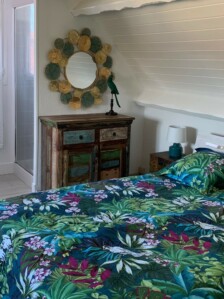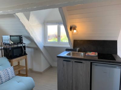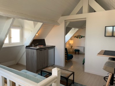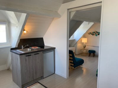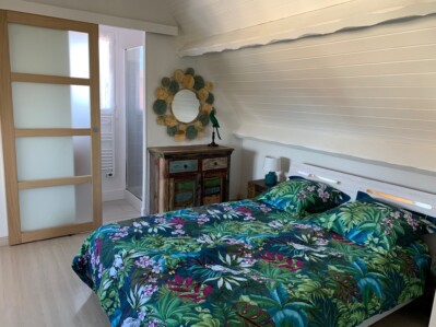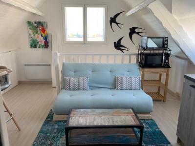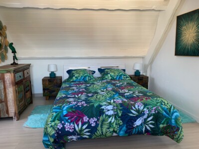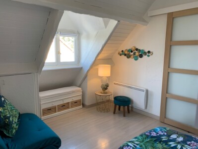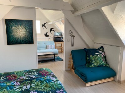 This room can welcome two adults and two children. It is located on the first floor and offers two separate rooms, the first of which consists of a living room with Smart TV, a dining area with large table and chairs, a fitted kitchen area equipped with a Nespresso machine, kettle, dishes, kitchen utensils, hob, refrigerator, oven and microwave oven to cook a few meals during your stay. A futon sofa in the living room offers sleeping from one or two people.